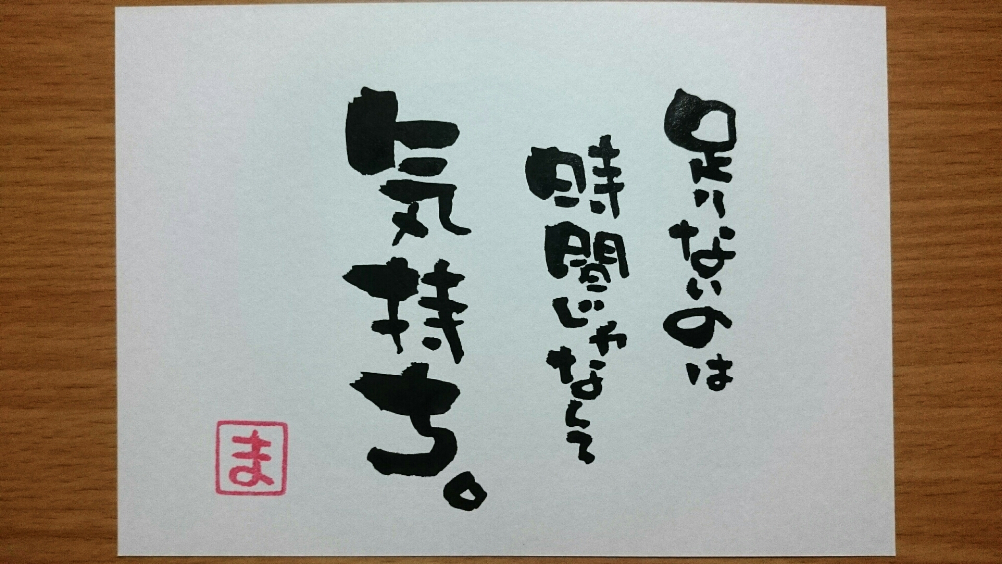 今日のひとりごと。446 『足りないのは時間じゃなくて気持ち。』 まだまだ本気じゃないんだよ! まだまだ! まだまだまだまだ!! 時間がないんじゃない。 時間はみんなに平等に与えられている。 本当に思ってたら、いつだってどこでだって考えてしまうし、何を見てたってそれと関連づけてしまう。 なんとかして考える時間、訓練する時間を作るようになる… 続きを読む »今日のひとりごと。446
