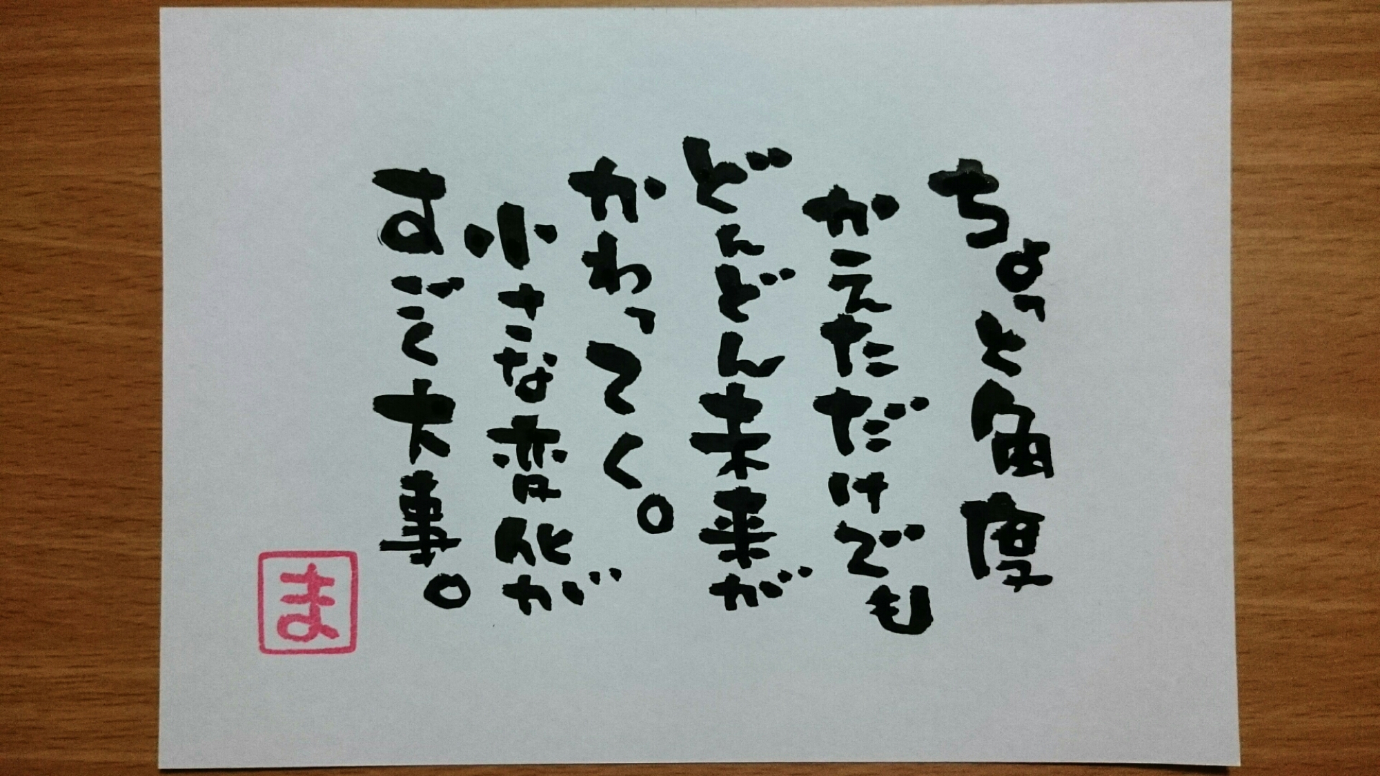 今日のひとりごと。447 『ちょっと角度かえただけでもどんどん未来がかわってく。小さな変化がすごく大事。』 ちょっとでも角度が違ったら、中心から進めば進むほど規定路線から離れてゆく。 まっすぐ進む限り、その差はどんどん広がってゆく。 現状に満足しているなら、寸分違わずその道を進むべきだし、現状に問題意識があるなら、ちょっと見る角度、進む角… 続きを読む »今日のひとりごと。447
